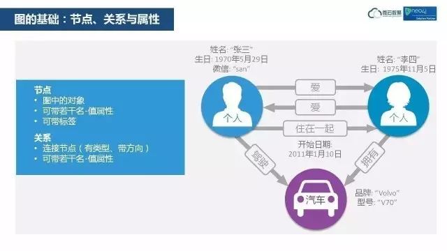 每个节点都可以带属性,第一个节点带了姓名、生日和微信三个属性。第二个节点带了姓名和生日两个属性。汽车这个节点,带有品牌和型号两个属性。这里,两个个人节点带的属性是不一样的,这说明同类型的节点不一定要有同样的属性。每一个节点的属性可以根据需要任意设置,可以多可以少,可以有可以无。上面两个节点之间有相爱的关系,爱这个关系是带箭头的,也就是有方向的。下面这个关系“住在一起”也是关系,也是可以带属性的,属性开始日期的值为2011年1月10日。