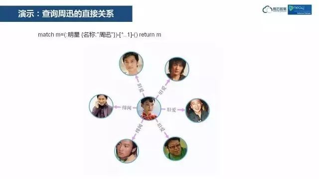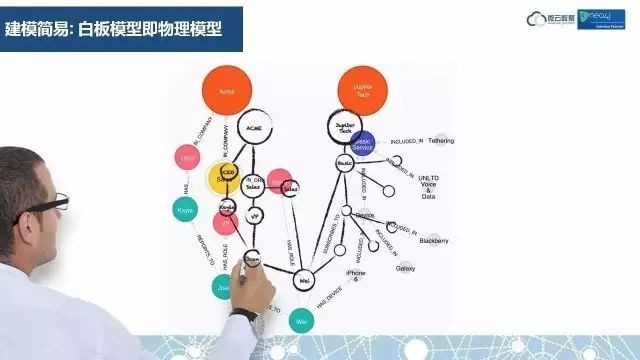 我们经常在白板上画一些模型,用来讨论我们的项目,我们通常是画圈、画线。如果用关系型数据库来处理的话,就要把它映射成表格后再处理。如果用图数据库处理的话,就和白板上的模型没有什么差别,所以说白板模型就是物理模型。现在这个图就是我们的物理模型,在图数据库中,表现现实世界的关系就这么直观。