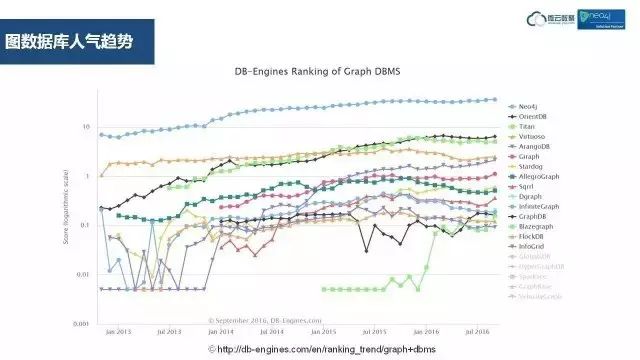 为什么要使用图数据库,这张图是按照数据库类别的一个发展趋势图,绿线代表的就是图数据,最底下的红线是关系型数据库。这张图从13年到16年,从这个图能看出来,关系数据库已非常成熟,应用也非常饱满,所以发展趋势不再往上升了。相反的,图数据库是崭新的数据库技术,随着互联网的发展,图数据库的应用需求也越来越大,人气指数也越来越高。