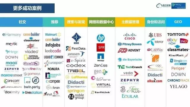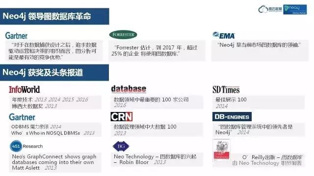 这是各种著名媒体报道的截屏。Forester预计2017年,有25%的企业使用图数据库,根据我们推广的结果看,国内很多厂家已经开始在用Neo4j了。所以达到25%比例这个目标会提前实现。