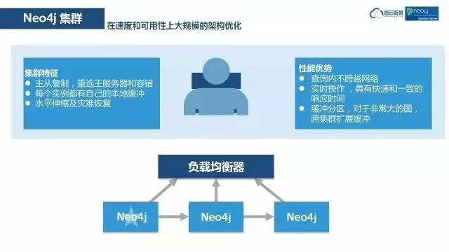社区版不支持集群,免费。企业版支持集群,是收费的。前面有负载均衡,后面有三个Neo4j服务器,其中一个标有五星,表示它是Master,其它的是Slave。如果Master出现故障,会有一台Slave主动变为Master。这是一个很好的负载均衡的机制。