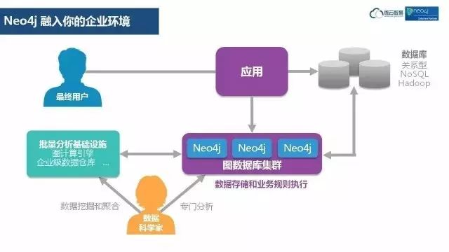 未来如何架构你的应用呢?以前的应用,是在上面这条线,从用户到应用,到数据库。未来我们用上Neo4j,在下方增加支路来访问Neo4j图数据库。