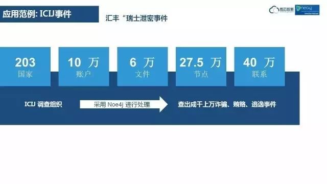 这是一个有趣的图数据库应用。有银行人员向政府举报,在瑞士汇丰银行,可能有潜在的诈骗、贿赂和逃逸事件。政府将收到的一堆文件转给ICIJ(国际记者调查组织)进行分析调查。这些记者是不懂IT的,如何处理这么多数据呢?技术顾问推荐他们使用图数据库Neo4j。他们装了一台Neo4j,然后把数据导进去,直接在Neo4j界面上进行查询,居然查出了成千上万的诈骗、贿赂和逃逸的事件。我举这个例子说明,Neo4j不仅仅是技术人员,也是很多非技术人员可以掌握的工具。