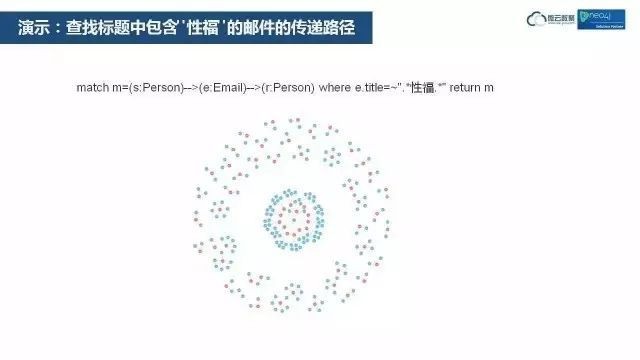 这个是舆情分析的应用,这个语句是查询标题中具有“性福”两个字的邮件的传播路径,红色是发邮件的人,蓝色是接收邮件的人。从这张图可以看出,公安局如果要抓发邮件的人,就直接抓最中心的这个人,他是始作俑者。