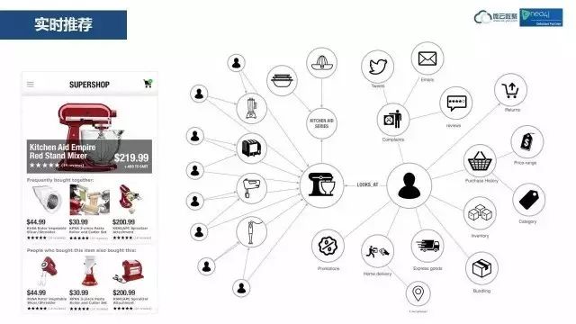 左边是实时推荐,右边是以这个人为中心的消费习惯,中间是商品和其他商品之间的内在关系。当这个人点击了中间这个商品,系统就对这两个网络进行计算,计算出这个人可能会对哪些商品感兴趣,并在左边实时显示出来。这是沃尔玛的案例。