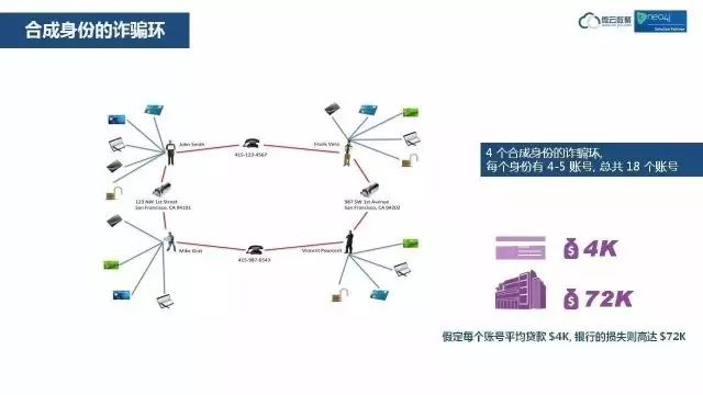 这是欺诈检测的应用。四个独立身份的人,每个人都有若干张银行卡,他们用每个卡到银行贷款或者借款4K美金,每个卡的风险不是很大。但是我们通过关系分析,发现上面两个人,经常给同一个电话打电话,左边两个人,经常往同一个地址寄邮件,底下两个人经常给同一个电话打电话,右边两个人,经常往同一个地址寄邮件。这四个人在某种程度上是一个合成身份的人,他们形成了一个诈骗环。如果这四个人,同时来找银行贷款,他们贷款的金额很可能就是72K美金。给银行带来的风险,就是72K的风险。