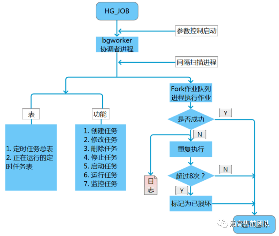 hg_job用于定时调用数据库存储过程和SQL语句,可设置时间定期自动执行。时间周期可以细分到年、季度、月、日、小时、分钟、秒。如下为功能架构图。