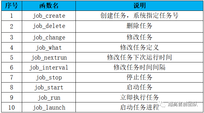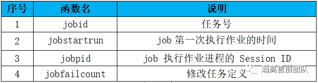 hg_job通过函数来管理定时任务,包括创建,修改等操作;通过2张元数据表hgjob.job和hgjob.jobrunning来记录任务内容,运行情况等信息。其中,hgjob.job记录定时任务属性;hgjob.jobrunning记录正在执行的定时任务的表,如下为hgjob.job和hgjob.jobrunning相关函数说明。