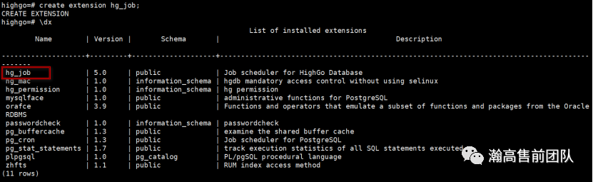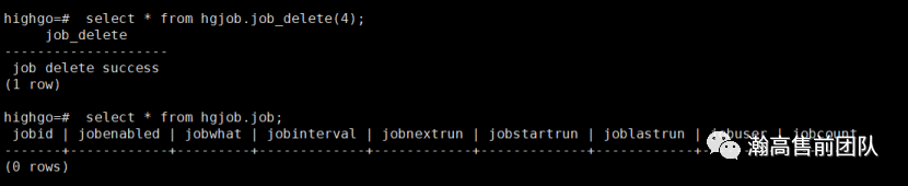 highgo=#select * from hgjob.job;highgo=#select * from test order by jobtime desc;highgo=#select * from hgjob.job_delete(4);highgo=#select * from hgjob.job;