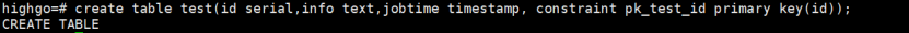 highgo=#create table test(id serial,info text,jobtime timestamp, constraint pk_test_id primary key(id));
