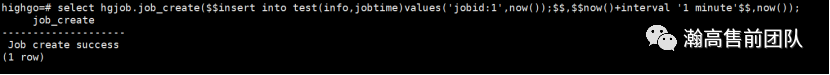 highgo=#Select hgjob.job_create($$insert into test(info,jobtime)values('jobid:1',now());$$,$$now()+interval '1 minute'$$,now());