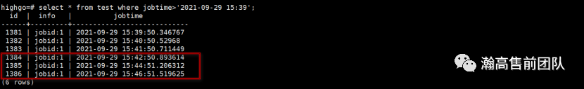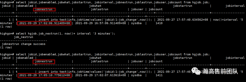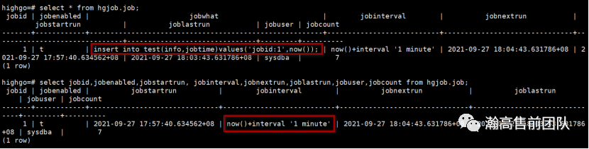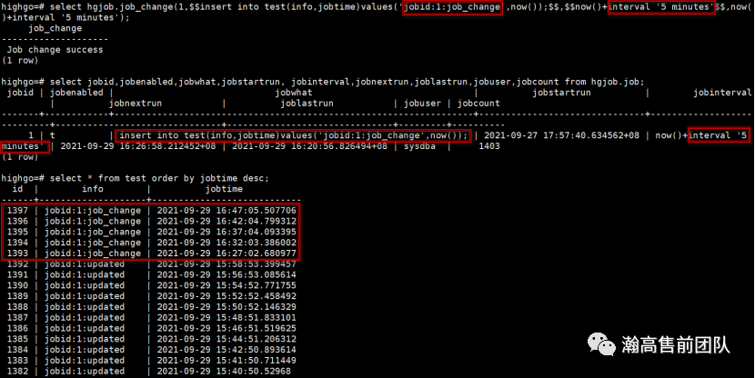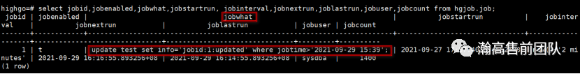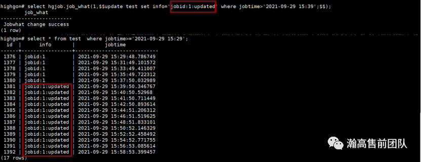 highgo=#select hgjob.job_what(1,$$update test set info='jobid:1:updated' where jobtime>'2021-09-29 15:39';$$);highgo=#select * from test where jobtime>='2021-09-29 15:29';