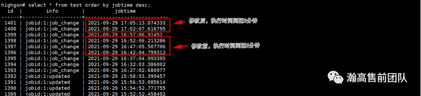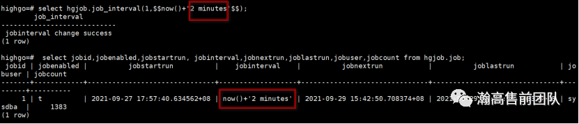 highgo=#select hgjob.job_interval(1,$$now()+'2 minute'$$);highgo=#select jobid,jobenabled,jobstartrun, jobinterval,jobnextrun,joblastrun,jobuser,jobcount from hgjob.job;highgo=#select * from test where jobtime>'2021-09-29 15:39';