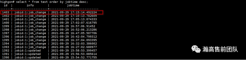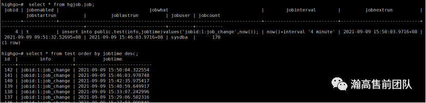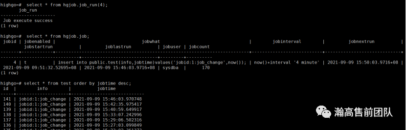 highgo=#select * from hgjob.job_run(4);highgo=#select * from hgjob.job;highgo=#select * from test order by jobtime desc;