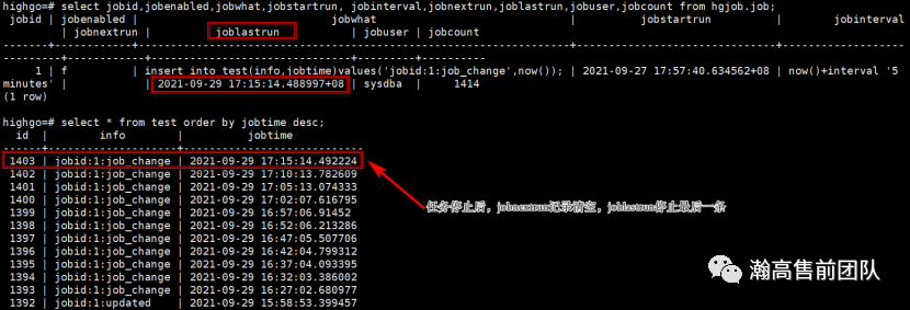 highgo=#select * from test order by jobtime desc;highgo=#select * from hgjob.job_stop(1);highgo=#select jobid,jobenabled,jobwhat,jobstartrun, jobinterval,jobnextrun,joblastrun,jobuser,jobcount from hgjob.job;highgo=#select * from test order by jobtime desc;