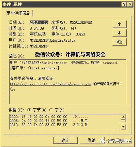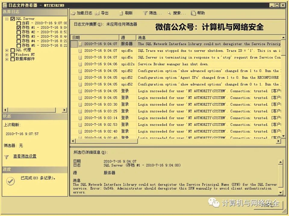 SQL Server 2005服务器的启动、关闭和暂停动作,都会产生一个事件记录,这个记录会记在Windows的事件查看器中。如果在SQL Server 2005服务器设置的安全性中,设置登录审核,那么符合登录审核条件的事件记录,也会记录在Windows的事件查看器中,下面介绍查看SQL Server 2005事件记录的办法。 ① 在计算机的【开始】菜单中单击【管理工具】,再单击【事件查看器】。 ② 在打开的【事件查看器】对话框中,选择【事件查看器(本地)】,再单击【应用程序】选项,则右边的列表框里可以看到所有的事件记录列表。 ③ 选择其中一个事件,将弹出如图1所示的事件属性对话框,从中可以看到事件的详细内容。这里是审核成功信息。通过这一项可以看出是否有黑客成功入侵。图1 事件属性对话框 ④ 事件查看器中有可能记录了各种不同应用程序的事件记录,如果只想查看和SQLServer有关的事件记录,可以右击应用程序,在弹出的快捷菜单中选择【查看】中的【筛选】选项。在这里可以筛选事件类型、事件来源、类别、事件时间等。 在事件查看器的安全性系统中,也会记载着与SQL Server 2005相关的事件记录,不要忘记查看它们。在Windows应用程序日志中,不仅记录数据库启动停止和身份审核信息,还会完整地记录Windows操作系统上发生的事件,以及SQL Server和SQL Server代理中的事件。