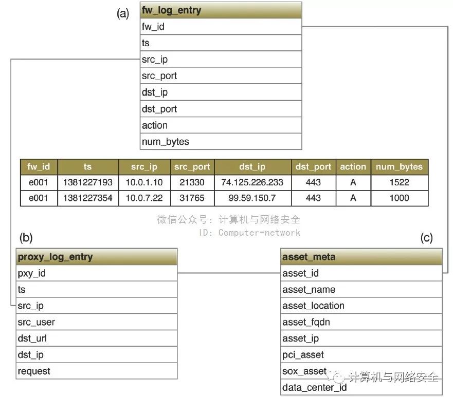 表中的数据以行和字段的形式被引用。“键”是一个独立字段或者字段的组合确保表中的每个记录能够独立识别,帮助区分表之间的关系。防火墙(图1a)和代理(图1b)表通过原IP地址(src_ip)“链接”到一起,并且它们又通过其id字段同时被“链接”到资产数据库(图1c)。