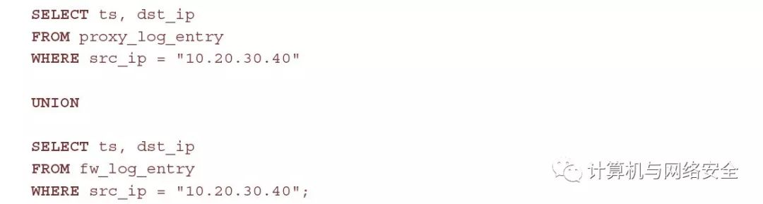 数据通过一种结构化的查询语言(SQL)进行访问和操作。SQL被设计为以用户可读和独立于平台的方式执行插入、更新和删除行为,再加上对数据执行查询的功能。对于图1中的示例数据库,您能够在代理和防火墙表中对一个源IP地址的目标信息(时间戳和IP)进行查询,使用下面的SQL描述:
