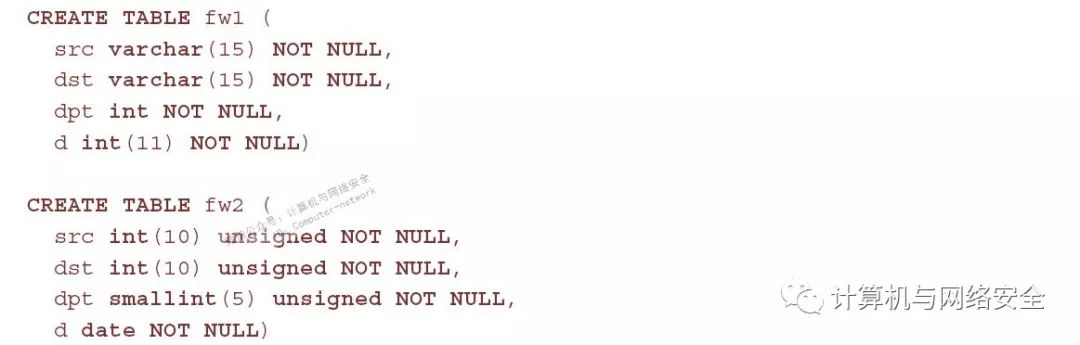 对于新接触SQL的用户,第一段代码生成了包含IP地址src和dst字段(其值为字符串,作为“0”…“9”)的数据表,而第二段程序生成了一个表,其相应的字段被存储为宽度为10的无符号整数。