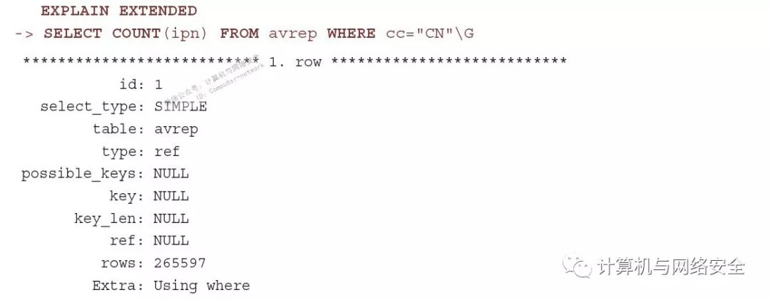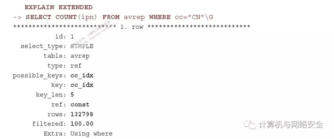 在这种情况下,EXPLAIN输出显示SQL查询引擎识别了cc字段的索引,使用它可以减少被扫描的行数。