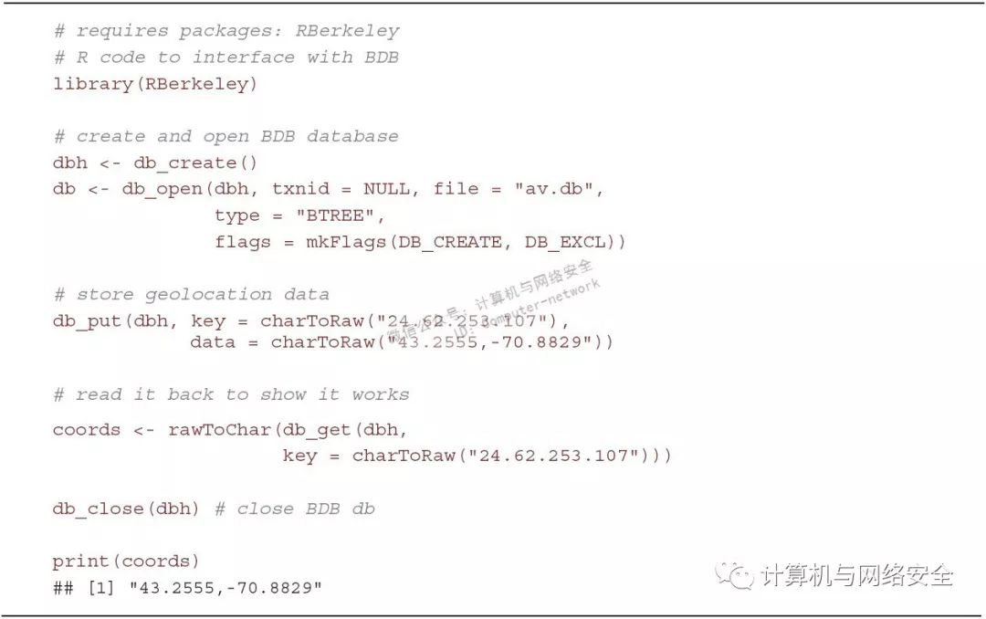 键/值存储在以下场景中性能很好,数据写入很少,但读操作很多,比如说高速缓存。再一次考虑IPv4地址空间。如果您只需要缓存一个IP地址的某些属性(比如,地理定位数据或信誉数据)并只需要本地资源,让BDB成为您的平台有很多优点。它没有传统RDBMS数据库的开销(尽管现代版本的BDB“遵循”SQL语法)并能够优化键和值数据结构。另外,键和数据是独立于语言的(也就是说,您可以用R填充BDB存储,并用Python来读取他们,反之亦然)。下图展示了一个非常基本的用R存储IP地理定位的例子。