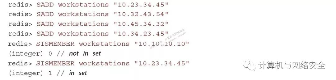 Set存储不重复的二进制安全串。这使其能很好地把元素关联起来做出快速的成员判断。比如,建立一个工作站集合,为每个节点分配一个IP地址,这就很容易判断数据包中的IP地址是否来自于工作区节点。