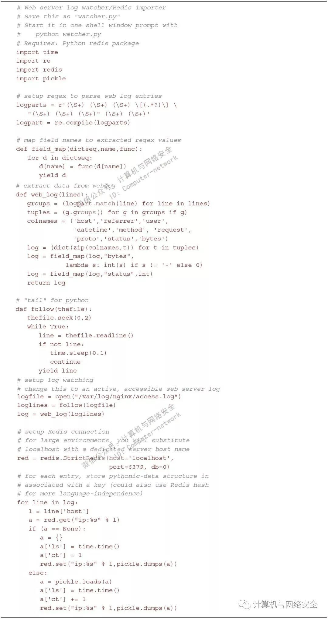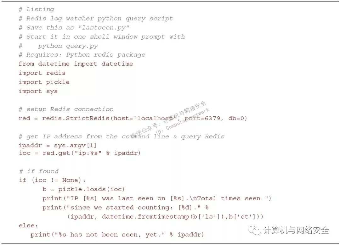 Python(redis-py)和R(rredis)对Redis提供了健壮的支持,并且API极易使用。假如您希望有一种集中并有效的方式知道您从外部资源获得的一个IP地址是否在受损害的范围中,这项需求不是通过在笨重的集中式日志管理系统中进行查询来完成,而是建立一个工作任务,从日志流中获得IP并将其以简单键值对或哈希的方式(包括所需的元数据)存储进集中式Redis数据库中来实现。watcher.py提供了一个如何“看”日志文件(在本例中,使用的是web服务器日志)并将其存储入Redis的Python示例。