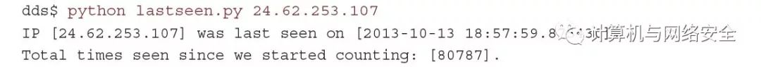 现在,可以通过命令快速知道您是否见过某个IP地址。(使用一个您已知的地址来代替下面的24.62.253.107从而获得类似于下面的“已查找到”的结果。)