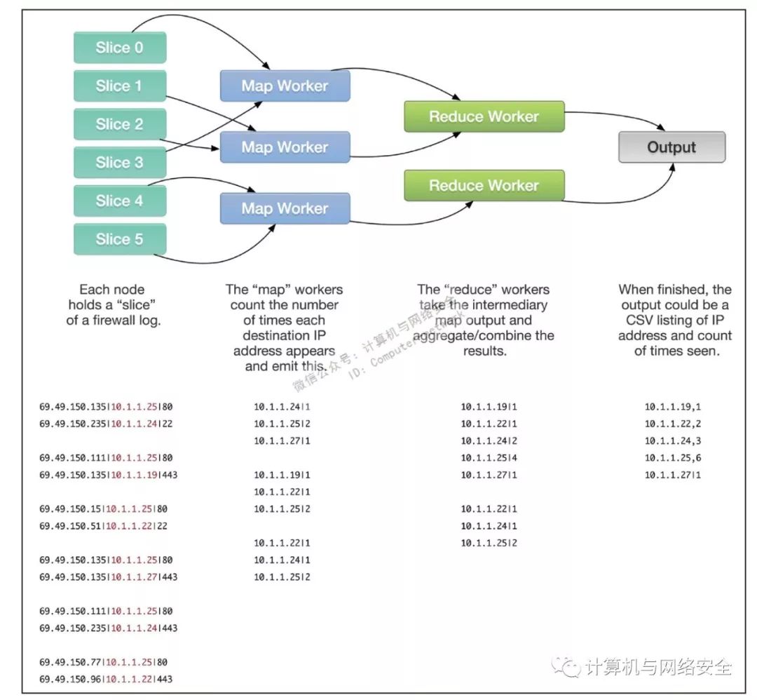 MapReduce是由谷歌创建的,其设计主要用于能够有效地计算大量节点集群(如数以千计的节点)中存储的数据。MapReduce通过将数据切分到整个集群中并安排一些工作节点,使之基于本地数据集合进行运算(map)从而得到一些中间结果。这些中间结果进而由其他工作节点整理、总结,得出最终结果(reduce)。图2展示了这一过程。