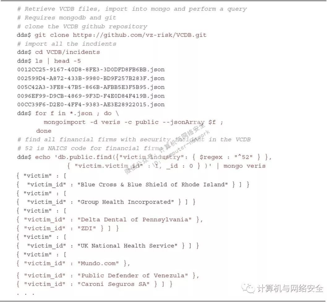 从这个简单的例子中可能很难看出增加这种额外复杂度的价值,但是如果回顾VERIS JSON,其中的优势就清晰多了。创建一个规范化的表结构来存储所有字段对于一个事件是可能的,但是没有必要赋予Mongo具有有效存储、处理以及复杂字段结构的查询能力。如果在之前的例子中,您已经安装了Mongo,您可以通过sudo apt-get install git命令安装git工具。这个工具在下图中需要使用,该工具可以在5分钟内从位于GitHub库(https://github.com/vz-risk/)的VERIS Community Database中下载并导入复杂事件的数据,并且在这之前不需要创建数据库或数据资料表模式。