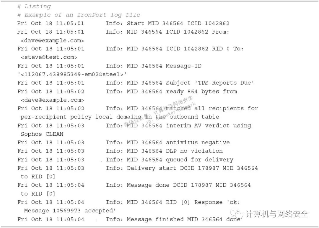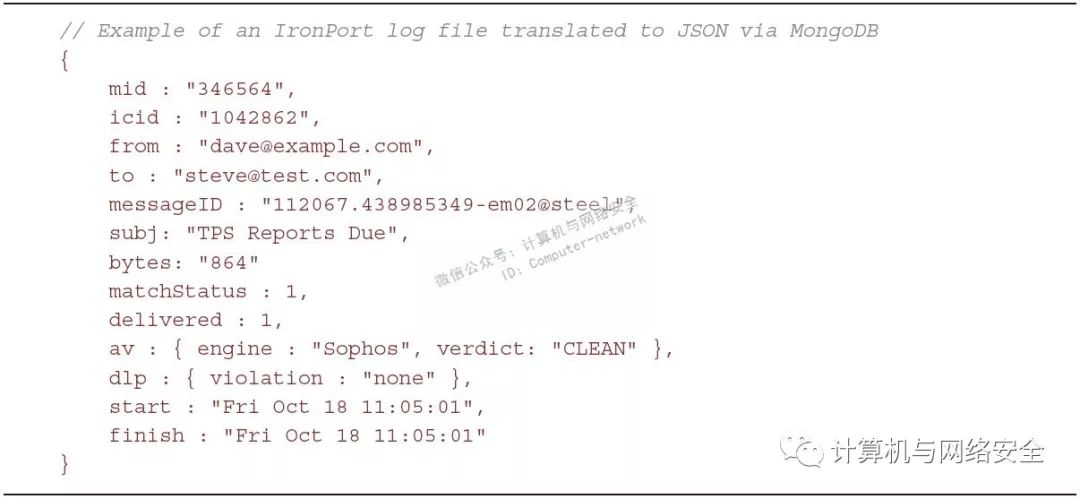在数据采集和清理过程中,可以将Mongo当做一种工具使用,在这里您可能已经在编程或脚本语言中使用了传统的内置结构。例如,日志处理功能是安全数据分析过程中不太光鲜的工作之一。它们具有不同的格式和大小,像思科IronPort的电子邮件日志就需要额外处理以便将其转化为适于分析的形式。请参见下图。