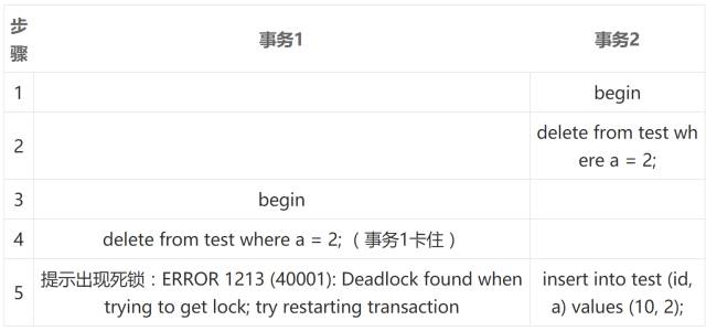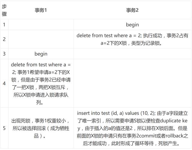 该死锁对应的日志这里就不贴出了,与上一个死锁的核心差别是事务2等待的锁从S锁换成了X锁,也就是lock_mode X locks gap before rec insert intention waiting。我们还是通过表格来详细说明该死锁产生的流程: