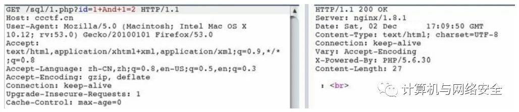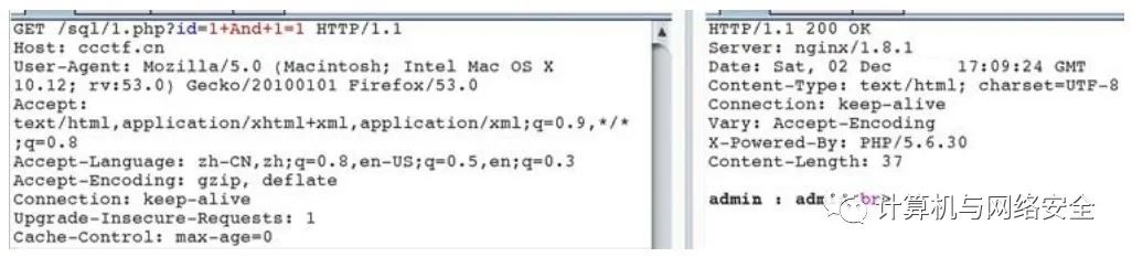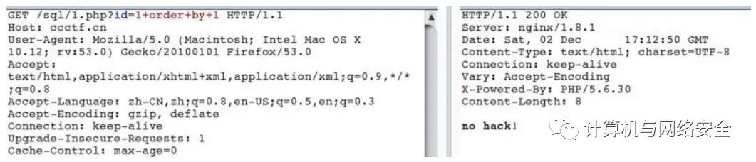 访问id=1',发现页面报出MySQL错误,当访问id=1 and 1=1时,页面返回“no hack”,显然是被拦截了,说明有关键词被过滤。使用关键字大小写的方式尝试绕过,如And 1=1(任意字母大小写都可以,如aNd 1=1,AND 1=1等),可以看到访问id=1 And 1=1时页面返回与id=1相同的结果,访问id=1 And 1=2时页面返回与id=1不同的结果,得出存在SQL注入漏洞的结论,如图1和图2所示。