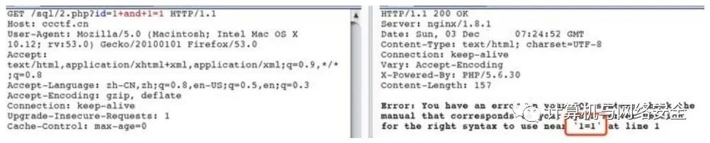 访问id=1',发现页面报出MySQL错误,接着访问id=1 and 1=1,页面依然报出MySQL的错误,但是从错误信息中可以看出,输入的and 1=1变成了1=1,如图5所示。