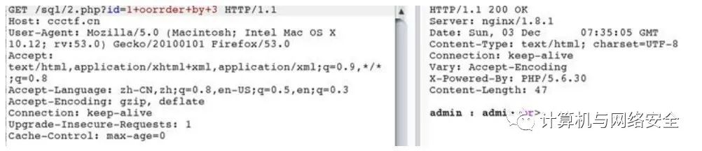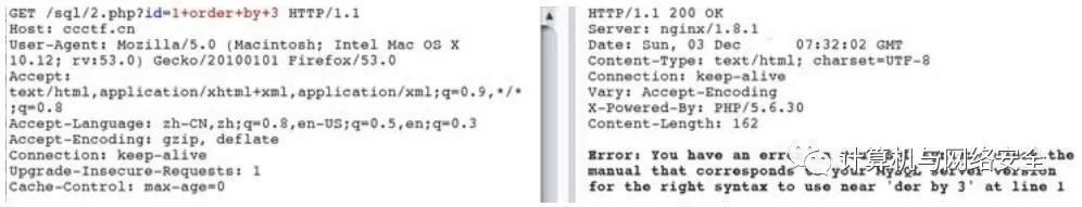 接着,输入aandnd 1=2,返回错误信息,判断页面参数存在SQL注入漏洞。当访问id=1 order by 3时,MySQL的错误信息为“der by 3”,如图7所示,所以这里并没有过滤order整个单词,而是仅过滤or,因此只需要双写or即可,结果如图8所示。