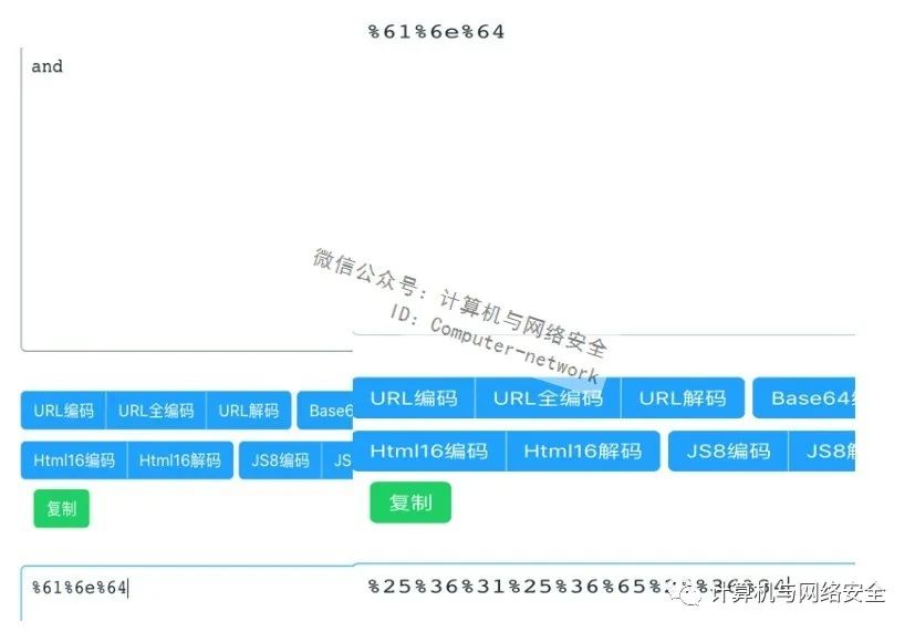 访问id=1',发现页面报出MySQL错误,接着访问id=1 and 1=1和id=1 and 1=2时,发现关键字and被拦截。尝试使用URL全编码的方式绕过拦截。由于服务器会自动对URL进行一次URL解码,所以需要把关键词编码两次,这里需要注意的地方是,URL编码需选择全编码,而不是普通的URL编码。如图9所示,关键字and进行两次URL全编码的结果是%25%36%31%25%36%65%25%36%34,访问id=1%25%36%31% 25%36%65%25%36%34 1=1时,页面返回与id=1相同的结果,如图10所示,访问id=1 %25%36%31%25%36%65%25%36%34 1=2时,页面返回与id=1不同的结果,如图11所示,所以该网址存在SQL注入漏洞。