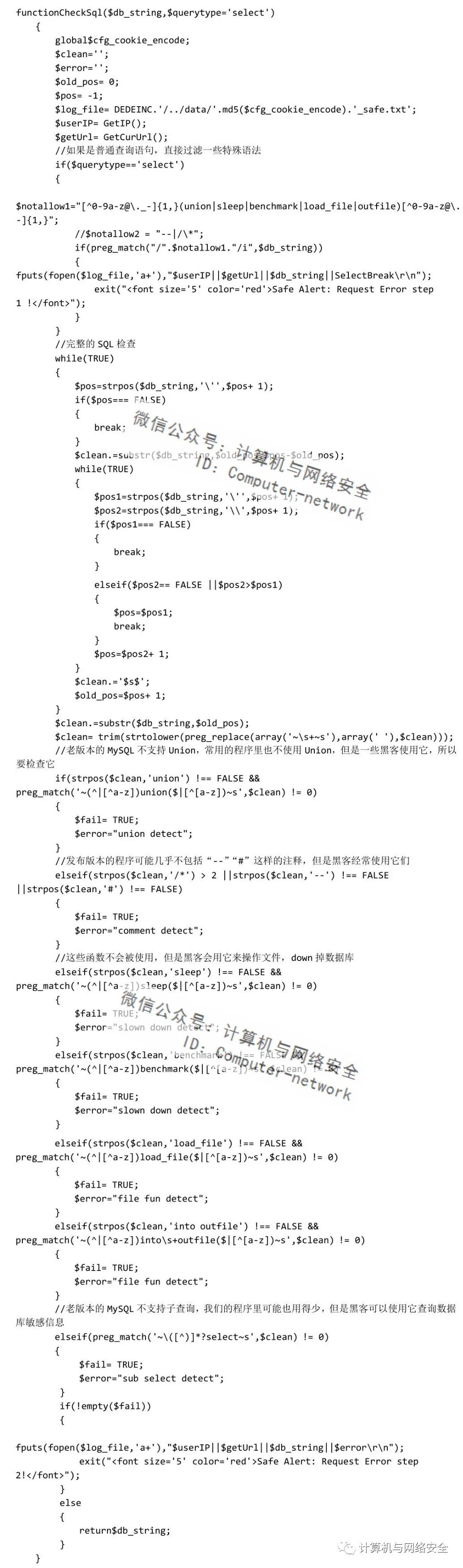 多数CMS都采用过滤危险字符的方式,例如,采用正则表达式匹配union、sleep、load_file等关键字,如果匹配到,则退出程序。例如80sec的防注入代码,如下所示。