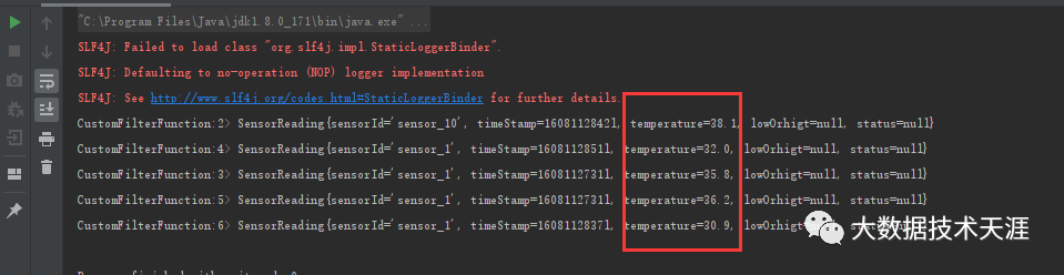// 创建流处理的执行环境StreamExecutionEnvironment env = StreamExecutionEnvironment.getExecutionEnvironment();// 从文件中读取数据String inputPath = "F:\\Projects\\BigData\\Flink\\FlinkTutorial\\src\\main\\resources\\sensor.txt";// 获取数据DataStreamSource<String> dataStream = env.readTextFile(inputPath);// 1、先转换成SensorReading类型(简单转换操作)DataStream<SensorReading> stream1 = dataStream.map(new MapFunction<String, SensorReading>() {@Overridepublic SensorReading map(String data) throws Exception {String[] arr = data.split(",");return new SensorReading(arr[0], arr[1], Double.valueOf(arr[2].toString()));}});// 调用自定义CustomFilterFunction类的,实现过滤DataStream<SensorReading> dataStreamFilter = stream1.filter(new CustomFilterFunction());dataStreamFilter .print("CustomFilterFunction");env.execute("Function test");