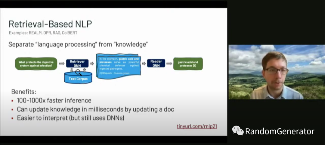 第二部分感觉挺有意思,主要介绍了 Building Scalable, Explainable, and Adaptive NLP Models with Retrieval[11] 这篇文章。作者们将数据搜索获取的思想融入到了整体模型架构中,一方面相对 end-to-end 大模型的推理来说效率提升了很多,另一方面对于模型的“决策过程”有了更多的透明度和可操作性。这个工作让我想起模型解释中通过样本来进行解释的一大类方法,包括我们在做误差分析时也经常会使用类似的方法来找到影响当前误判样本最类似的训练样本是哪些。