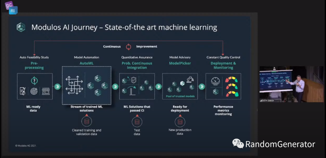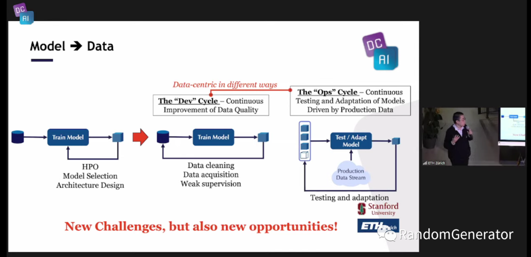 ETH 的 sessions 由 Ce Zhang 来主持,并做开场介绍。下面的这张流程转变与前一天的内容很类似,不过额外强调了一下除了 Dev cycle 外,我们还有很大一部分精力需要来处理 Ops cycle,即模型上线后的监控,自动重训练或决策的自适应等。