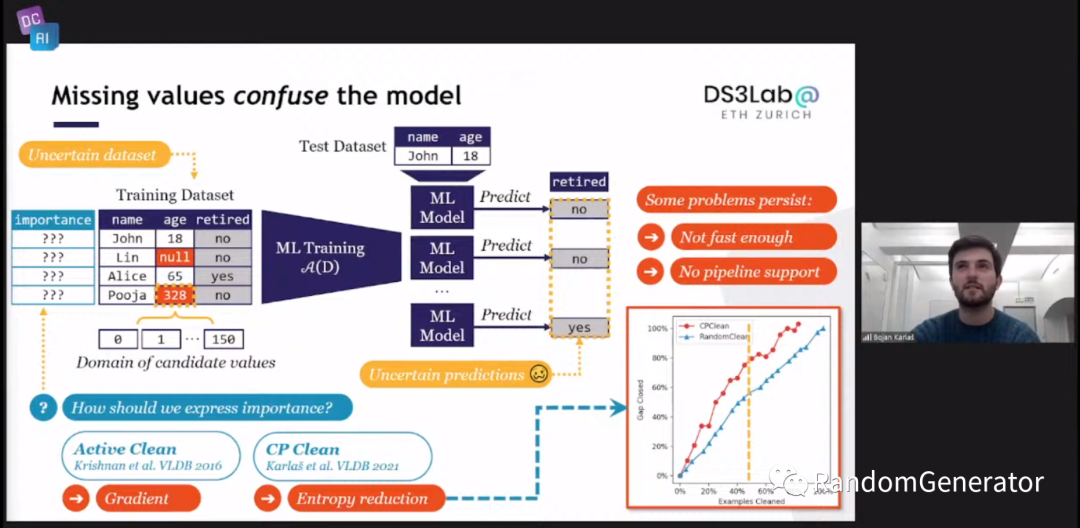 接下来是一些具体工作的介绍,例如对于选取缺失值数据来进行清洗的问题,有发表在 VLDB 的 Active Clean[20] 和 CP Clean[21] 两个工作: