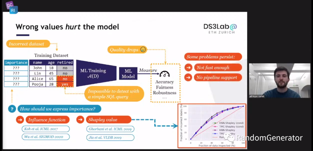James 先从一个识别皮肤疾病的实例开始,提出了模型准确率在学术论文与实际应用中出现的巨大偏差问题。然后引出了他们的一个工作,来自于 Stanford 的 Data Shapley[5],粗看了下简介跟用于模型解释的 shap 有着类似的思想,不过把评估目标从特征换成了具体的 training sample,即判断每一条数据 sample 对于模型最终效果的贡献度的大小。这跟可解释机器学习里的 influential instance 希望达到的效果也有些类似,但直接用 naive approach 来做从计算开销来说显然不太现实,作者应该是做了不少这方面的优化工作。