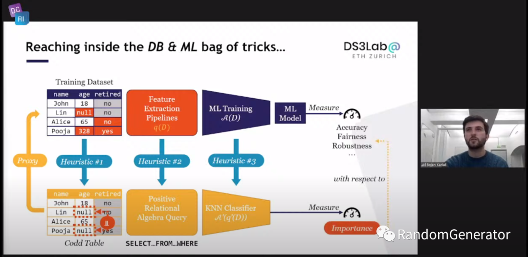 Selection with Guarantees using Proxies[8],Matei 举了个例子,比如在自动驾驶场景中,我们希望能获取到所有包含黄色交通灯状态的图片。在这篇文章中,作者通过一些 proxy function(如简单模型,规则)对数据进行分组,然后通过设计的算法来以一定的置信度获取到所需要的数据,可以达到非常高的效率。这个想法听起来跟 Snorkel 的弱监督学习会有些相似。 Similarity Search for Efficient Active Learning and Search of Rare Concepts[9],看起来主要是对 active learning 的改进,将搜索范围限定到目标样本的最近邻范围中,可以大大提升其搜索效率。虽然想法比较简单,但相关的应用非常的有效。 Finding Label and Model Errors in Perception Data With Learned Observation Assertions[10],Matei 主要举了对 label 质量检查的例子。传统的检查一般是通过人工撰写相关业务规则,或者使用一些统计值来发现一些数据质量问题,这篇文章中则通过一些手段来自动学习这些 assertion。没有仔细看实现细节,但感觉上使用一个预测模型去做预测,然后针对那些高置信度的 label 就可以实现类似的效果?