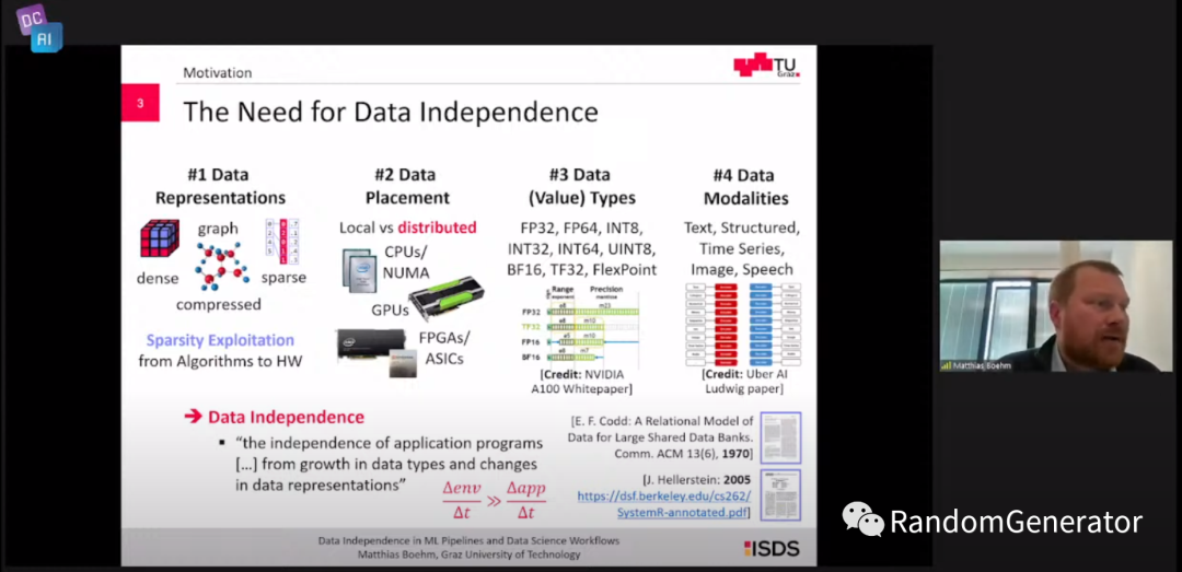 这个 talk 来自于 Graz University of Technology 的 Matthias。Data Independence 的概念是数据存储和表示的形式的变化不应该暴露给上层应用。这个定义在数据库系统中比较常见,典型的比如大多数的数据库都统一对外暴露 SQL 接口,不论内部的存储计算引擎如何变化,应用层都不需要做任何修改。