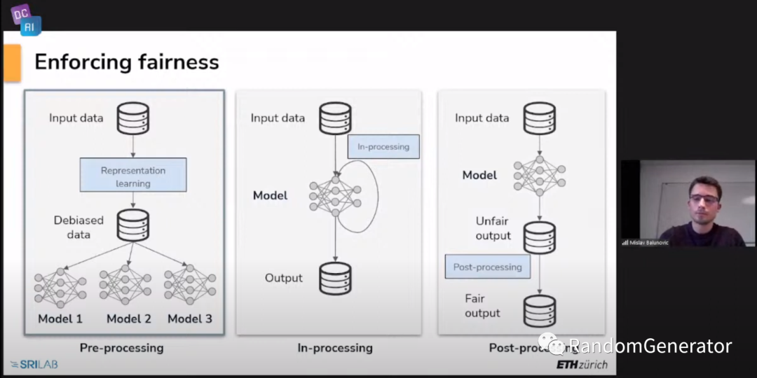 这个 talk 来自于 ETH 的 PhD 学生 Mislav。主要从 Data Centric 角度出发来看待模型的公平性问题,总体的框架是通过表征学习来处理原始数据,保证学习到的 representation 后续应用于其它模型的训练都能保证公平性: