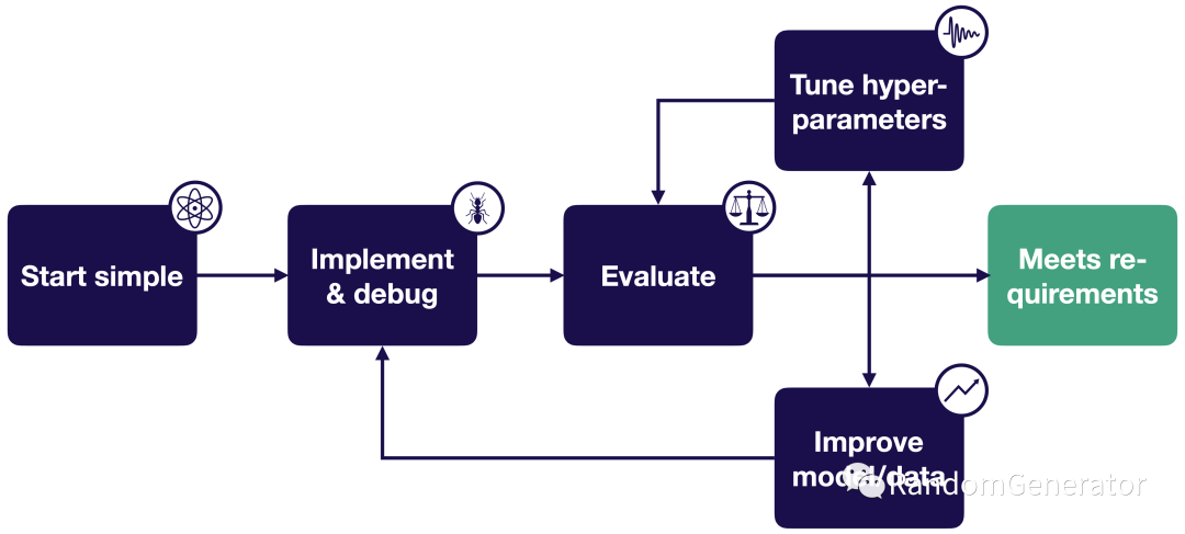 从简单的pipeline开始,例如选择最简单的规则,或者基础模型。以深度学习模型为例,我们可以选择最基础的MLP模型,adam优化方法,不加任何regularization,使用标准归一化方法,选取一个子集数据进行尝试。 实现并跑通pipeline。确保模型能够运行,并在小数据集上overfit,或复现一些已知结果。 评估并分析结果。后续会详细介绍分析手段方法。 参数调优。对模型的各种参数,模型结构进行各种调整。 数据与模型调优。修复数据中的问题,做数据增强,引入不同类型的数据,收集更多数据,或者特征工程预处理方面的操作。模型方面可以使用更加高级/复杂的模型结构,引入ensemble等。