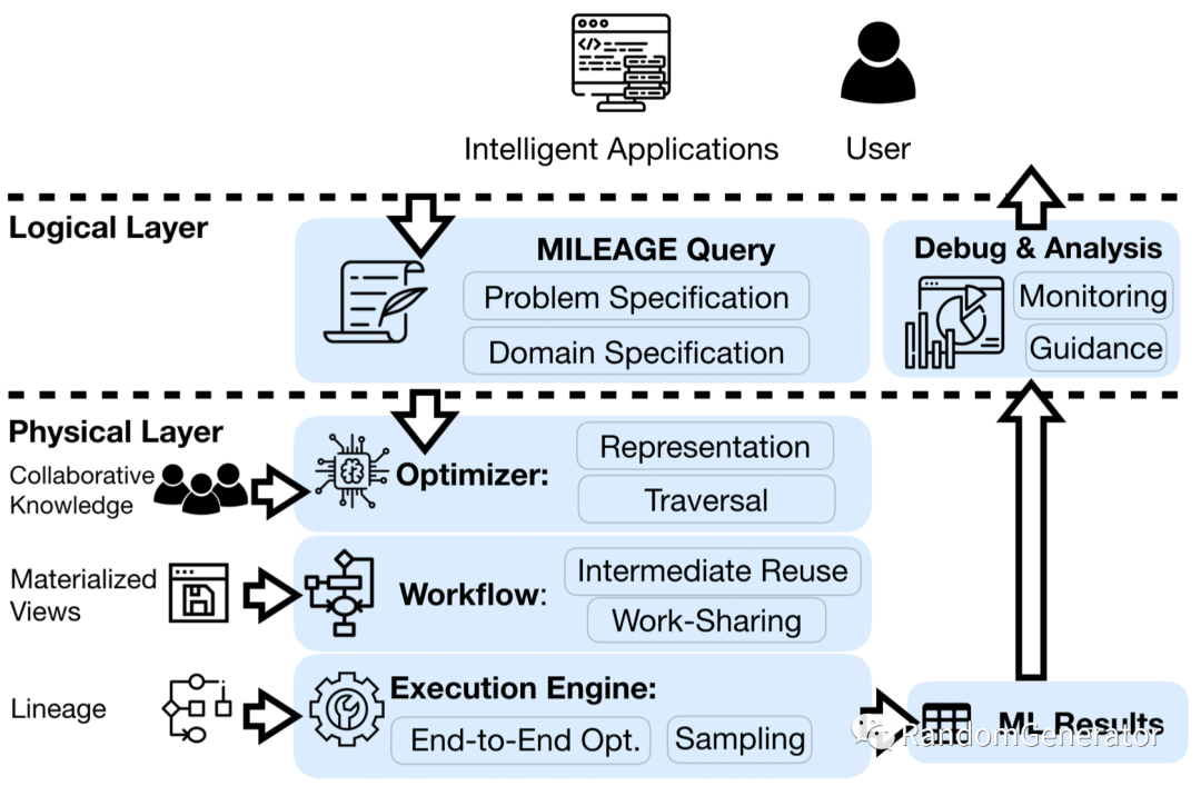 也是一个非常有意思的工作,用数据库系统的分层思想来考虑human-in-the-loop人机结合AutoML系统的设计。例如像SQL般易于使用的DSL来便于用户输入问题定义与描述,然后在下层有优化器去形成经过优化的物理执行计划(在这里变成了ML workflow),并最终返回结果。
