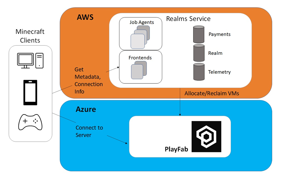 Realms服务代码通过执行关键任务(如记录元数据更新、处理Realms内的购买行为、预配/撤销游戏服务器)处理了来自Minecraft客户端的所有Realms请求。整个Realms服务代码最初托管在AWS,通过60多个虚拟机承载游戏的大部分核心服务。