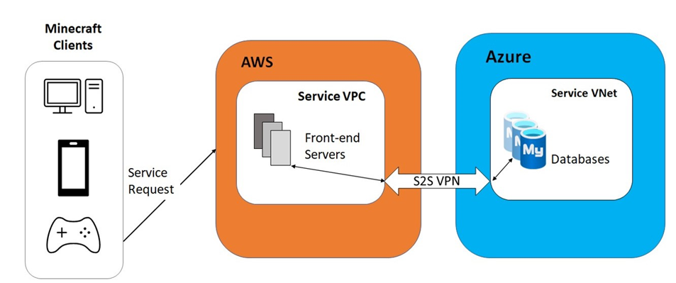 此时整个后台的多玩家服务器部分已经运行在Azure中,而其余存储和数据库等系统还在AWS,大致架构如下图所示: