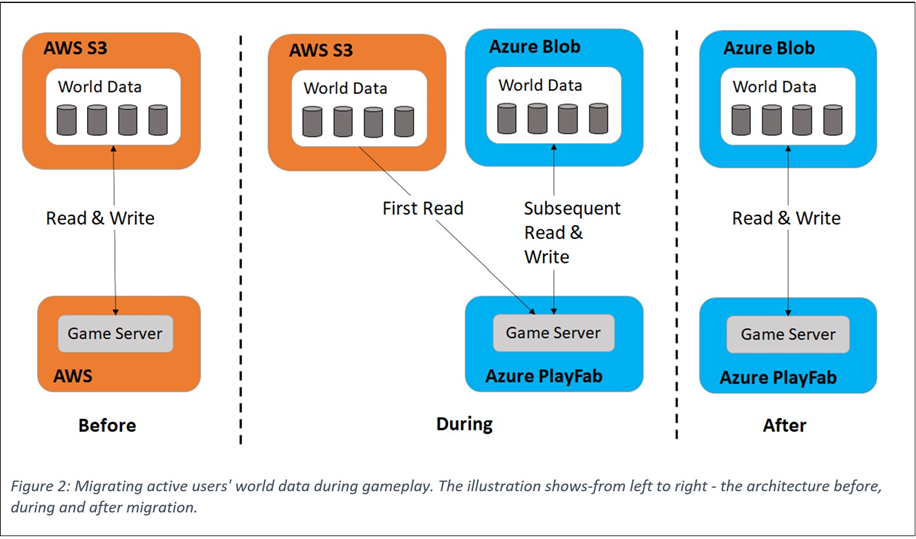 Mojang计划在尽可能避免对游玩过程产生影响的前提下将所有世界数据迁移至Azure Blob存储。这一过程会导致游玩遭遇停机,因为在移动数据的过程中,玩家将无法访问自己的Realm。为避免停机,Mojang采用了这样的策略:当现有的活跃Realm世界被首次访问时,从AWS读取现有的世界数据,随后将所有更新写入至Azure Blob存储。以后再访问这些数据时,将只通过Azure Blob来访问。